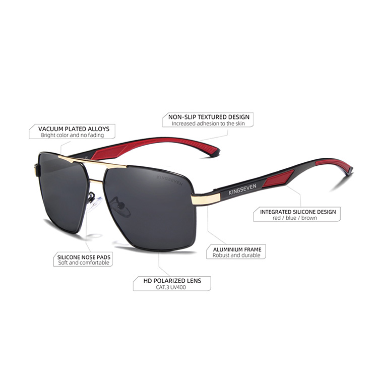 KINGSEVEN แว่นกันแดดการบินสำหรับผู้ชายอะลูมิเนียมทรงสี่เหลี่ยมแมกนีเซียม 7719 ทำจากโลหะผสมอลูมิเนียมคุณภาพสูง ซึ่งมีความแข็งและไม่เสียรูปง่าย การชุบสูญญากาศมีสีสดใสและไม่ซีดจาง แผ่นรองจมูกซิลิโคน นุ่ม สบาย มั่นคง และกันลื่น; เคสซิลิโคนยาวดั้งเดิมของ KINGSEVEN เพิ่มการออกแบบพื้นผิวกันลื่นเพื่อเพิ่มการยึดเกาะกับผิวหนัง โลหะสีเงิน ทอง สีปืน กรอบสีและสีดำผสมผสานกันเพื่อสร้างเอฟเฟกต์ภาพที่สดใหม่และทันสมัย เลนส์โพลาไรซ์ความละเอียดสูง CAT.3 UV400 ป้องกันการตก ป้องกันแสง ป้องกันรังสียูวี และการออกแบบฟิล์มสีฟ้าด้านในสามารถเพิ่มผลการป้องกันของเลนส์และทำให้สวยงามยิ่งขึ้น ในผลิตภัณฑ์นี้ เราได้เพิ่มเลนส์โพลาไรซ์สี เลนส์ฟังก์ชั่นการมองเห็นตอนกลางคืนสีเหลือง และเลนส์ฟังก์ชั่นโฟโตโครมิกที่สามารถใช้ได้ทั้งในร่มและกลางแจ้ง